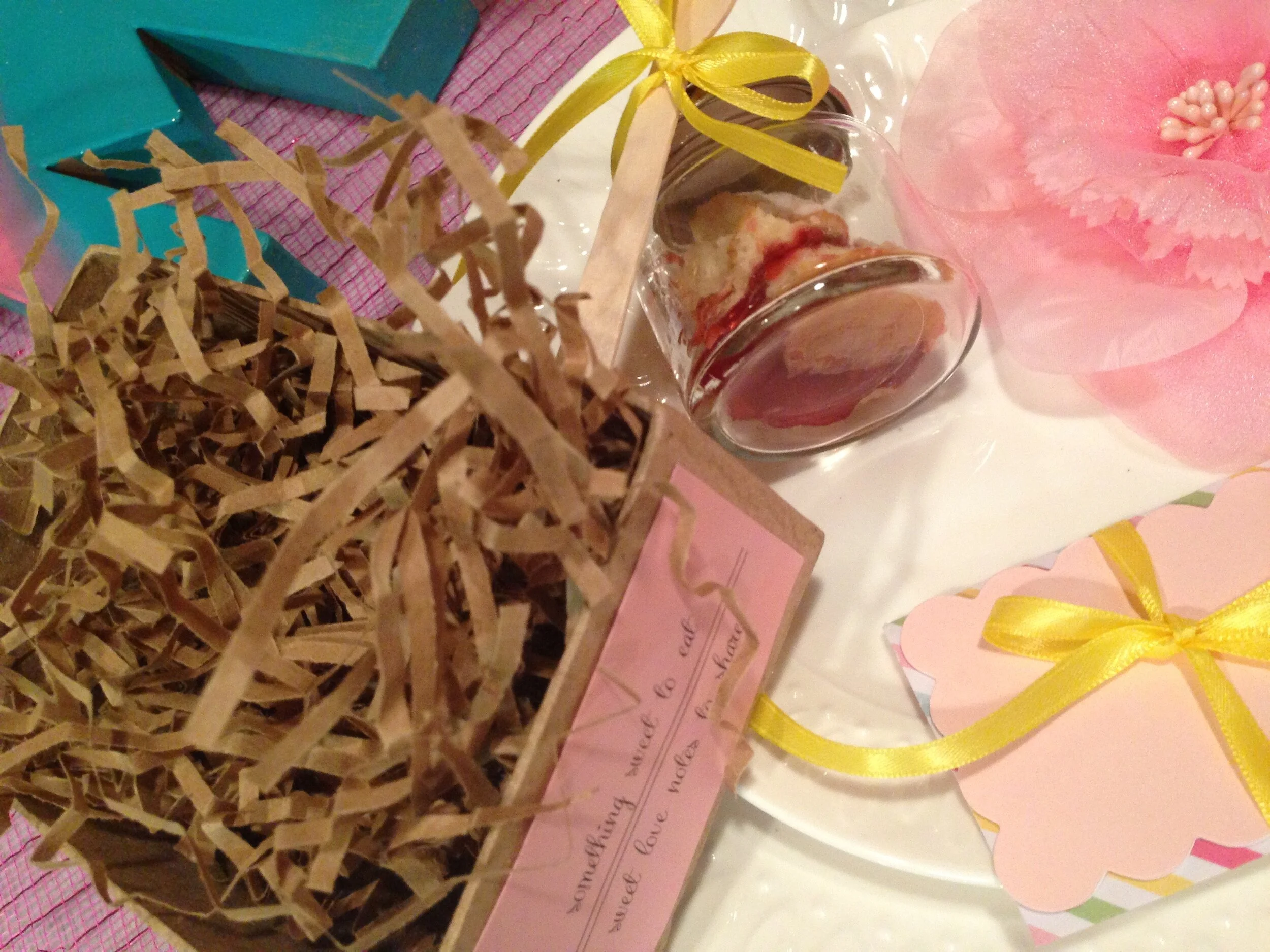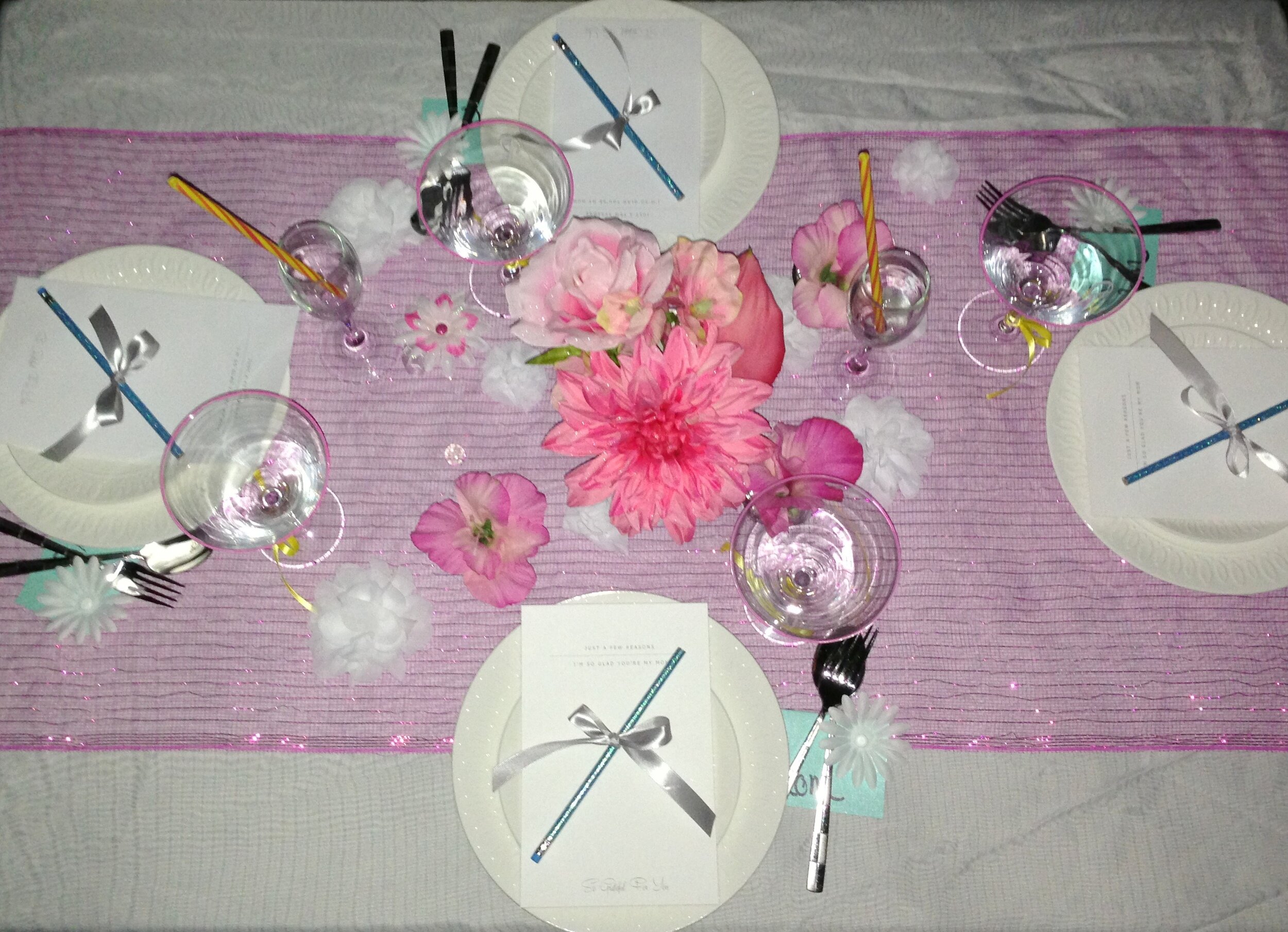 I created the stationary myself, layering it with a beautiful velvet pattern and a thick pink cardstock. I embellished each invite with 3D flowers & ribbons.