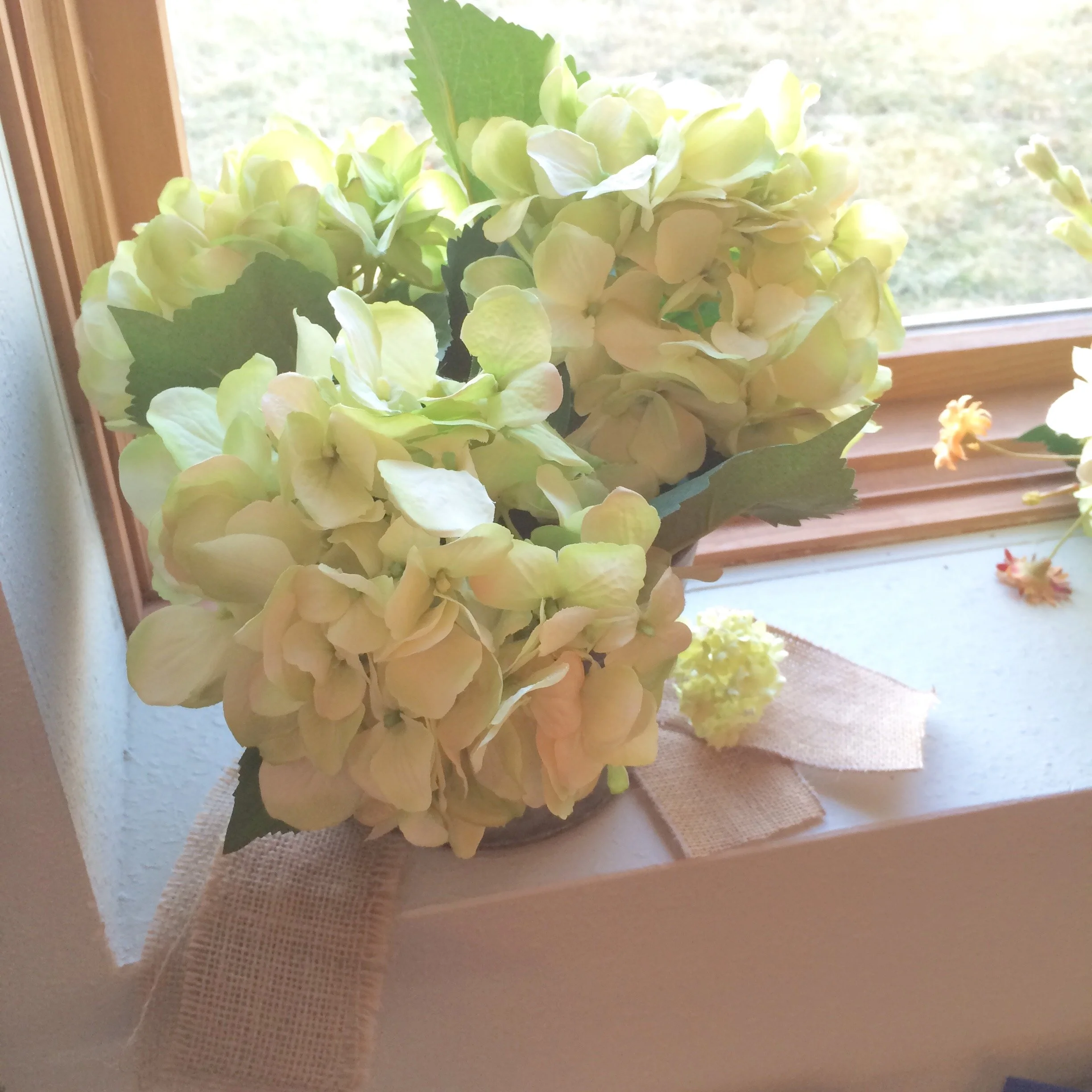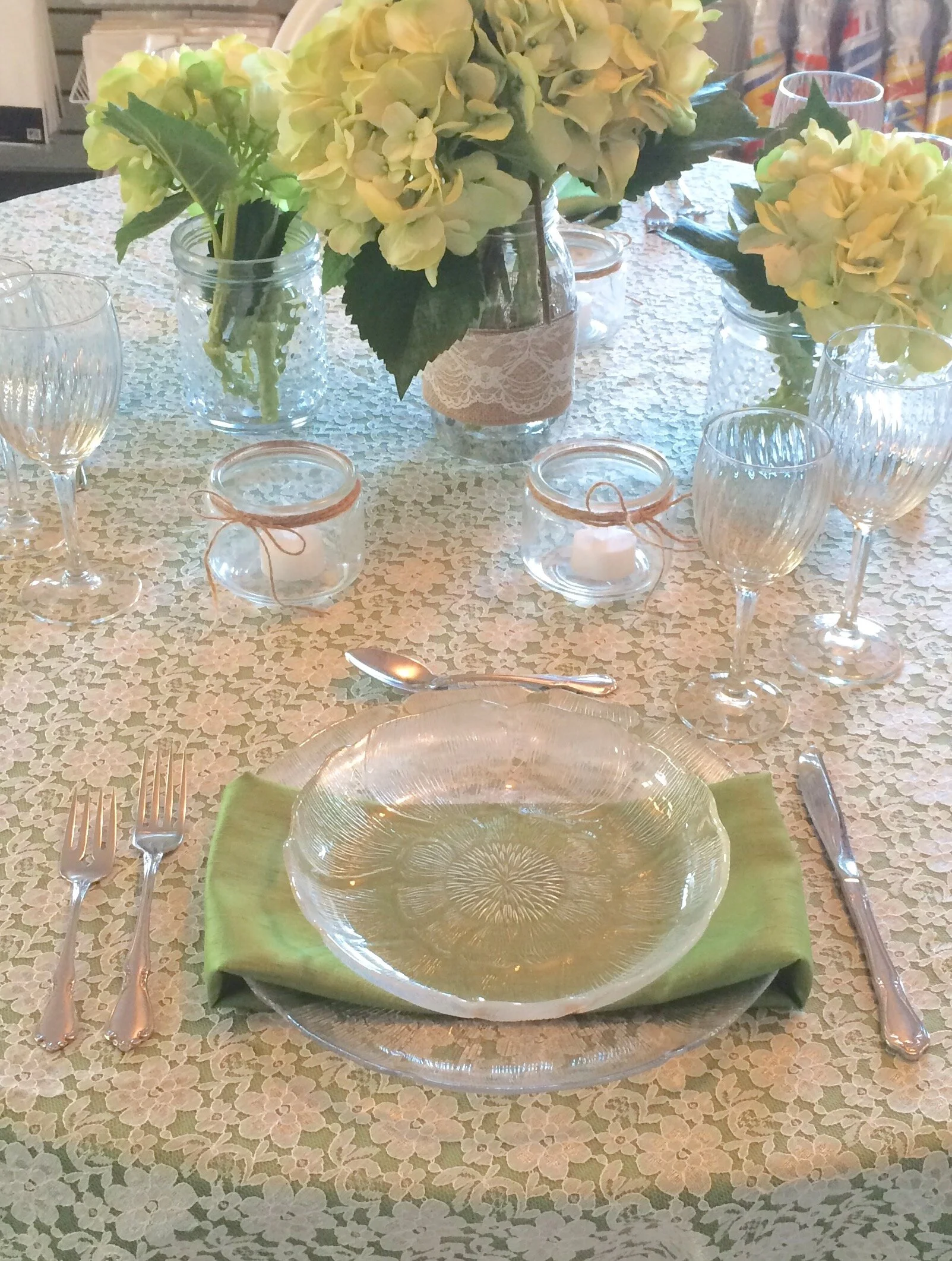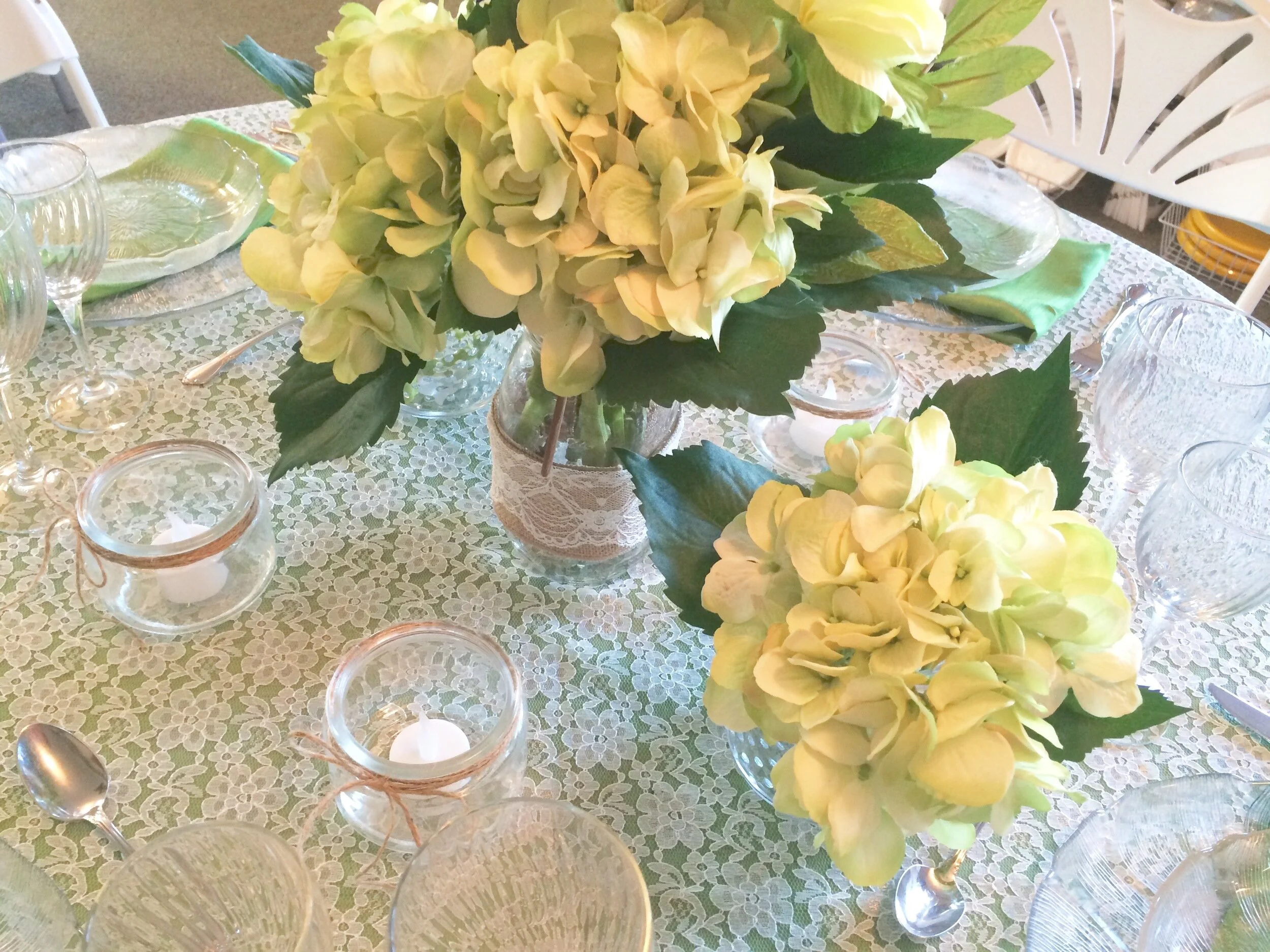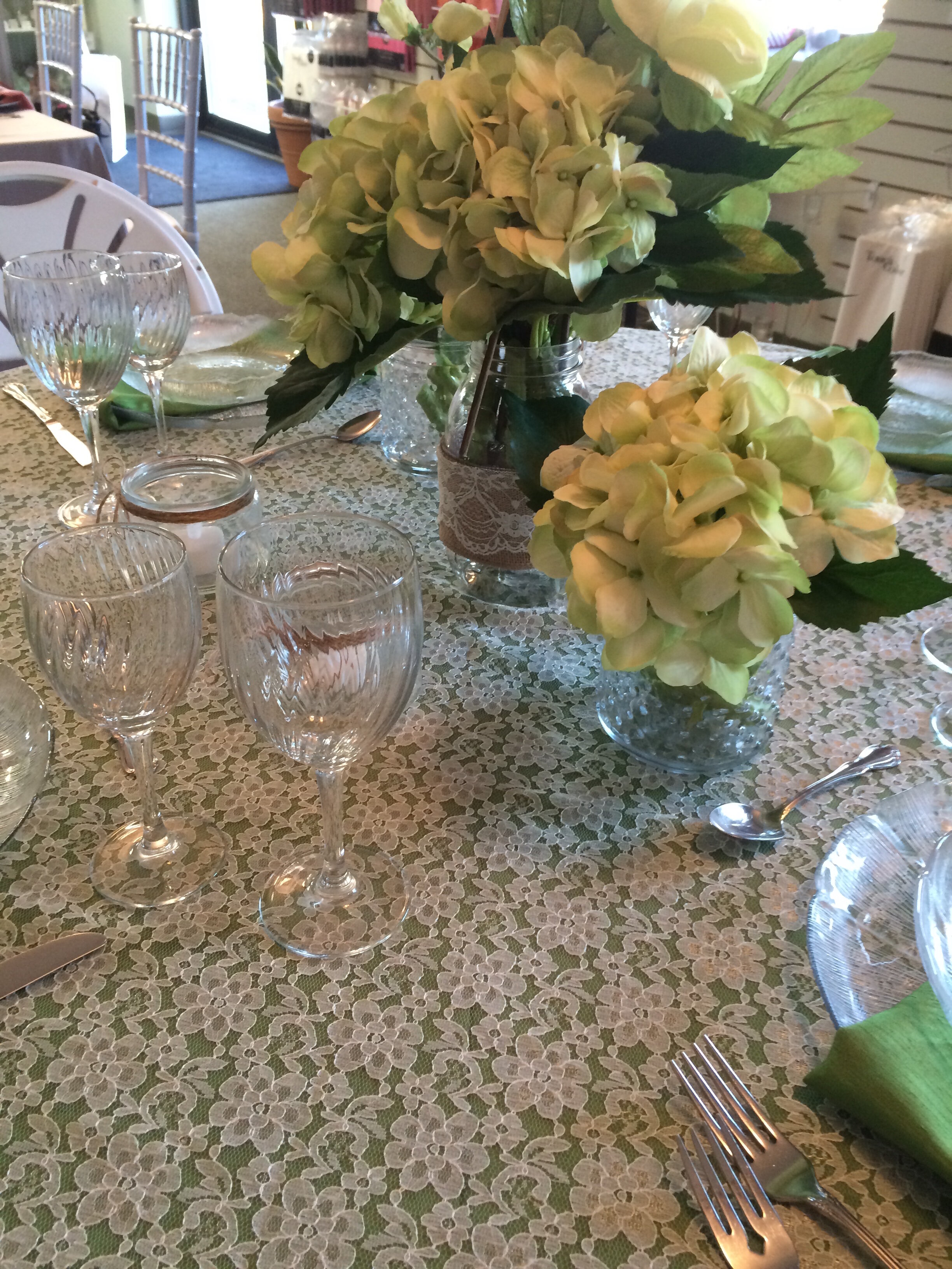 I used an iridiscent specialty linen in Emerald, with a lace overlay and matching Emerald linen napkins. Using burlap and lace wrapped mason jars filled with the simple greenery and hydrangeas give this table a relaxed feeling. Let's kick off our boots and throw back a heineken !