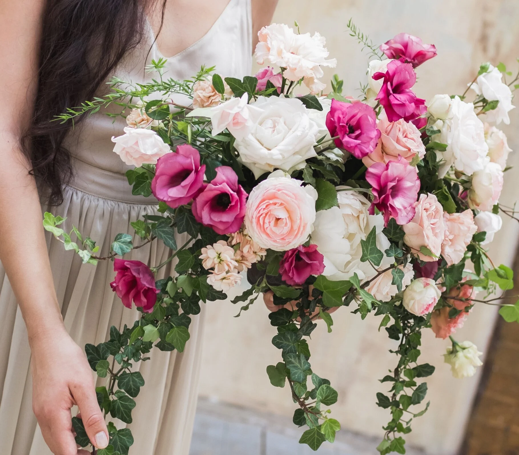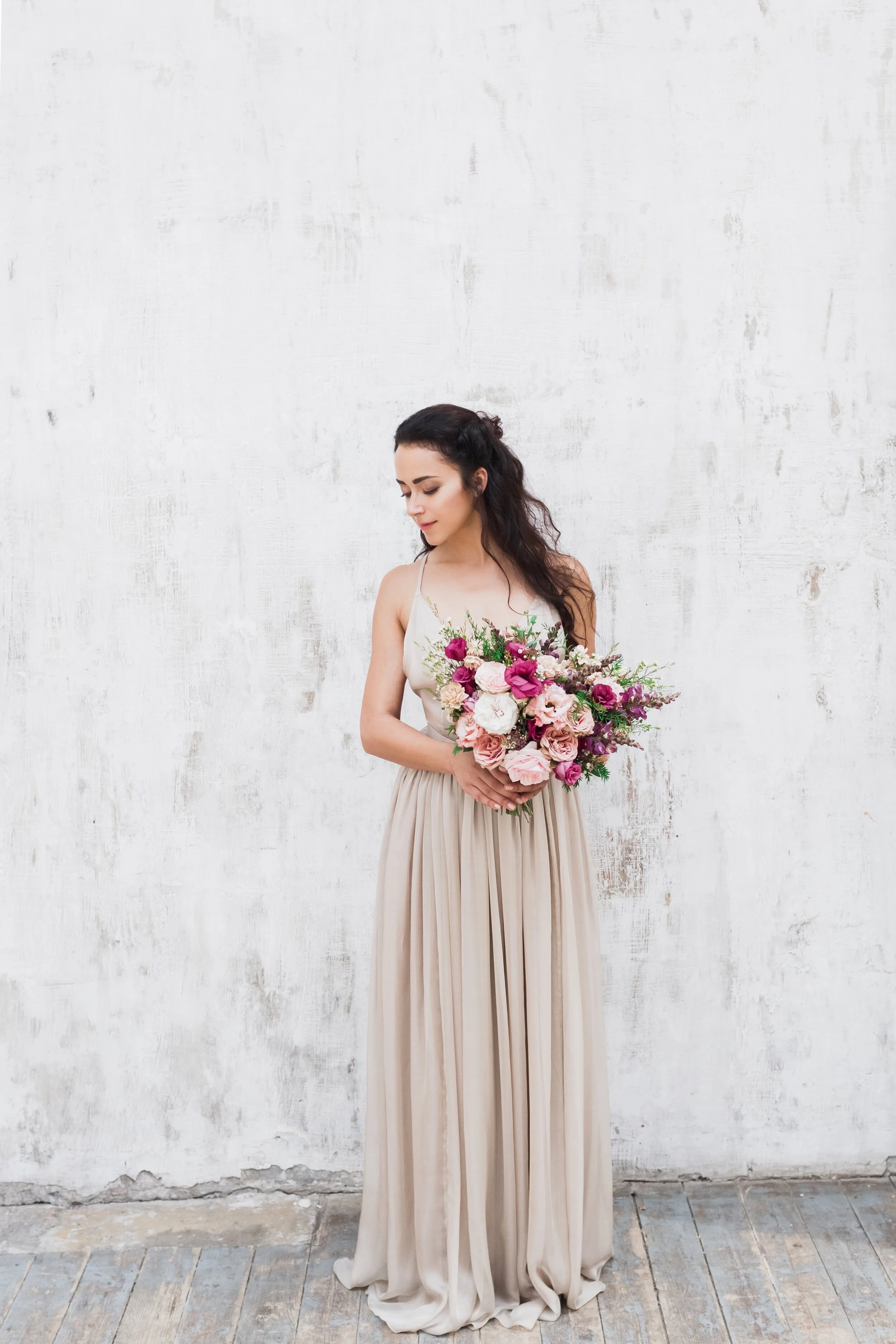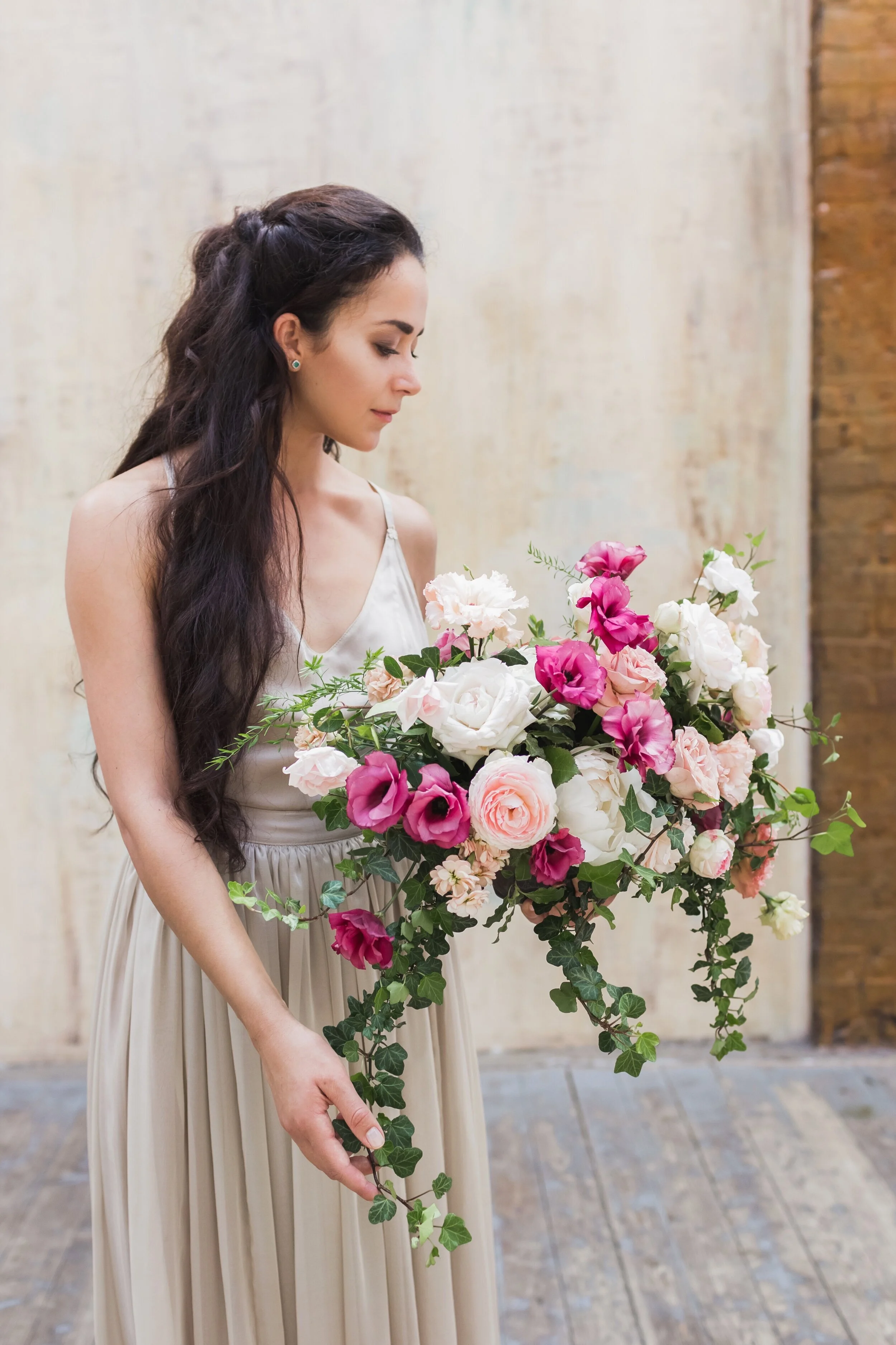 These taupe and deep mauve pairs so well with the fuchsia. I haven’t had a chance to work with this floral palette in quite some time - and it has me all kinds of giddy. I used an abundance of the same type and colors of flowers to really make a large impact - and keep the cost of the shoot manageable. The ivy and greens were locally sourced from the student botanical gardens.