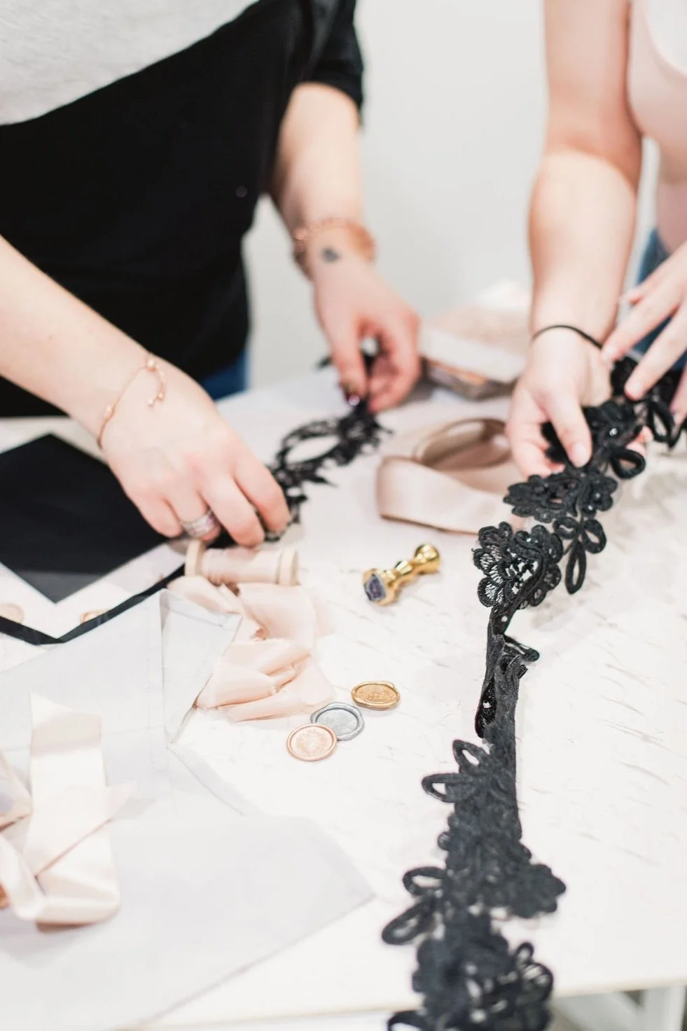 We found this beautiful black laser cut lace and it inspired the remaining details and pieces for the shoot. I envision it adorning the bride and the bouquet. With touches of black on the table top set against very feminine textures and colors. I’m excited for all the partners on this upcoming shoot and details we are working through to bring it to life.
