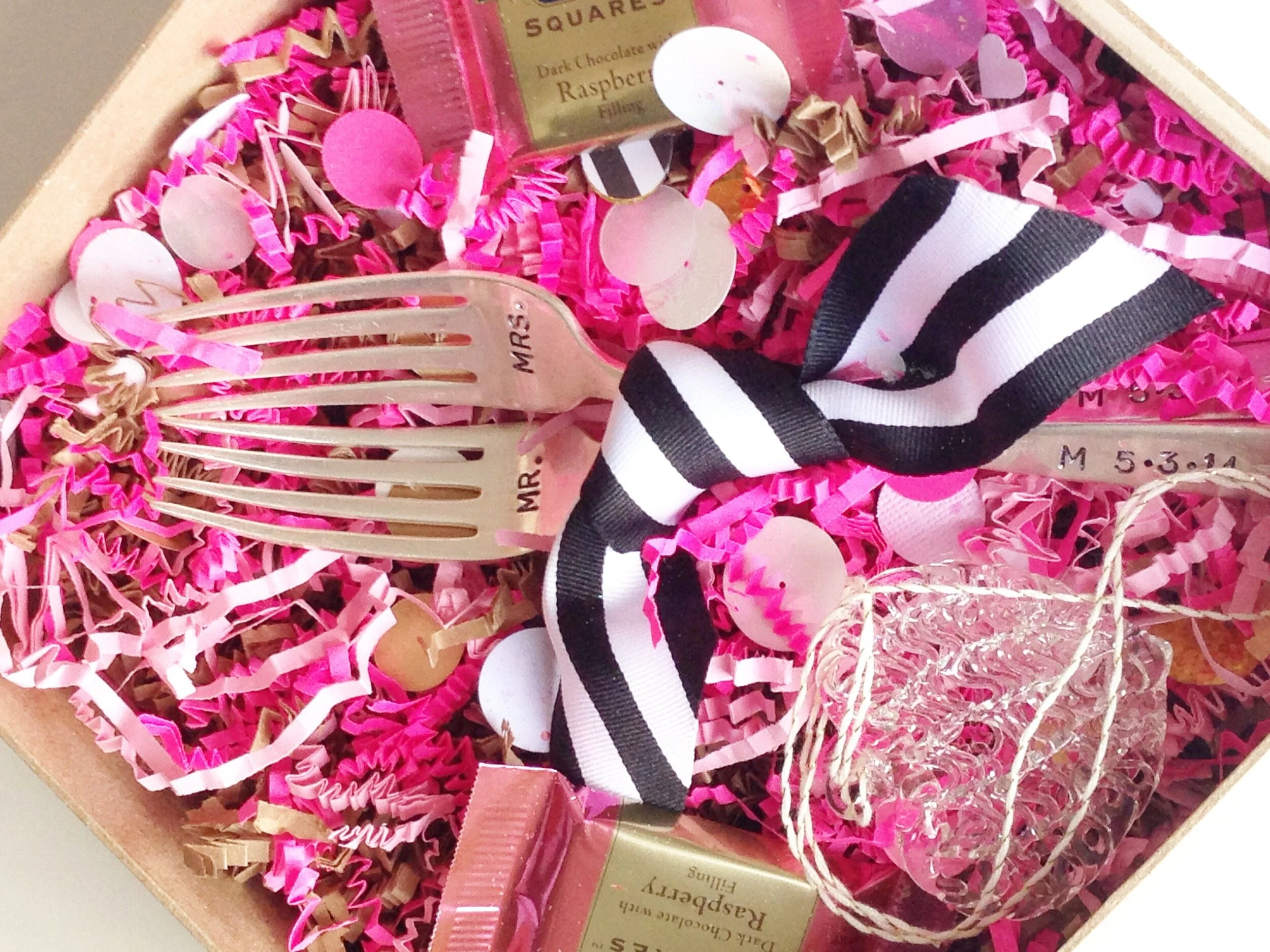 I don't know about you, but my pretty packaging makes me super happy. That striped ribbon and all that happy confetti – gah! I think putting these together might be one of my favorite things to do. I am planning a little marketing outreach to vendors here in the area as well as you loves afar that I adore. To send some Cassandra Love your way, to connect with you and hopefully give you lots of info about me and my little boutique business. These little boxes of pretty have completely inspired me. I love these so much, I want to send a box to myself and you betcha, I'll be placing an order of forks for JD and I; like ASAP.
